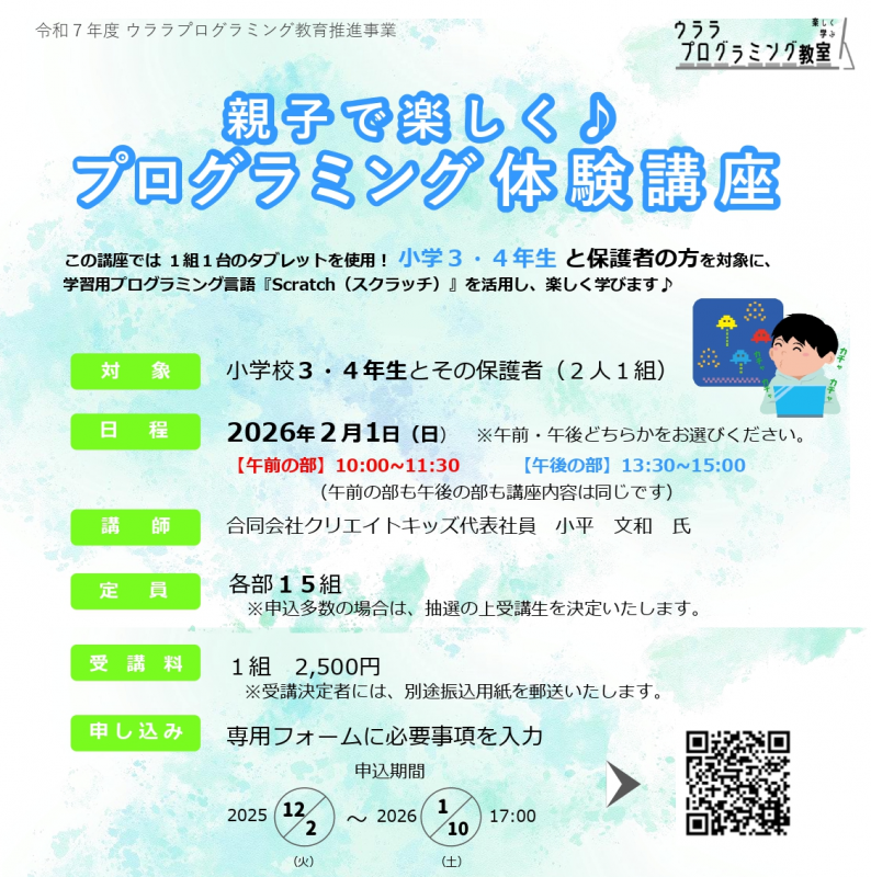 親子プログラミング体験講座の申し込み 12月2日から開始! 令和7年度の茨城県県南生涯学習センター『親子で楽しく♪プログラミング体験講座』の申し込みが12月2日から開始されます。 こんなことに興味ある人が対象です スクラッチをやってみたい! スクラッチでアニメーションや、ゲームを作ってみたい 親子での楽しめる体験をしたい これからの時代、プログラミング的思考を持つのも大切です。ここにピンっと来た方はぜひお申込みください。