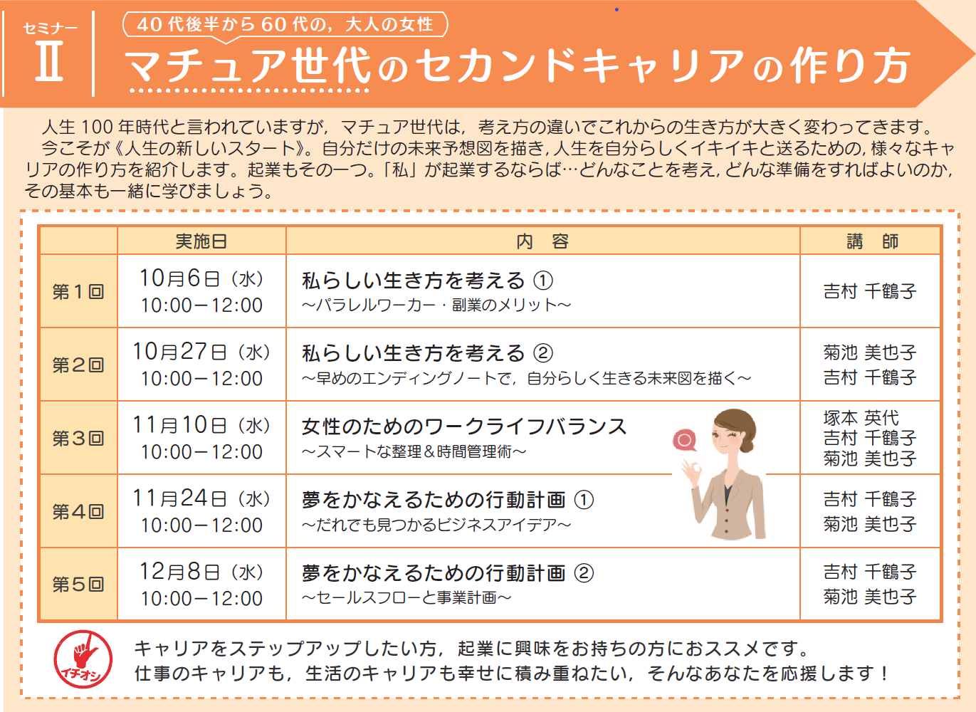 中高年の方の早期リタイアや定年退職後の背簡素キャリア、出産・育児後の女性の社会復帰等、転職や復職、起業に関する講座等を開設し、キャリア探しのために様々な職場に対する関心を高める機会や、第二の人生における職業を考える講座を実施しています。